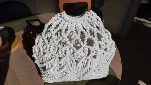 materiaal: katoen (200 m van gevlochten 5mm touw) en houte handvatten (gelakt)